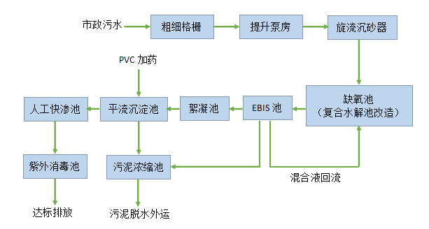 針對以上改造問題,匯恒環(huán)保設(shè)計團隊在充分考慮該水廠實際運行情況,以及工藝先進可靠、經(jīng)濟成本合理、充分利用現(xiàn)有設(shè)施條件等要素的基礎(chǔ)上,通過加裝機械格柵、增設(shè)旋流沉砂器、生化增設(shè)EBIS(改良A2O)池、深度處理采用“絮凝池+平流沉淀池+人工快滲池”、加裝紫外消毒設(shè)施等解決方法,大大提高系統(tǒng)脫氮除磷性能,并實現(xiàn)系統(tǒng)擴容需求,出水水質(zhì)穩(wěn)定達到一級A標準。