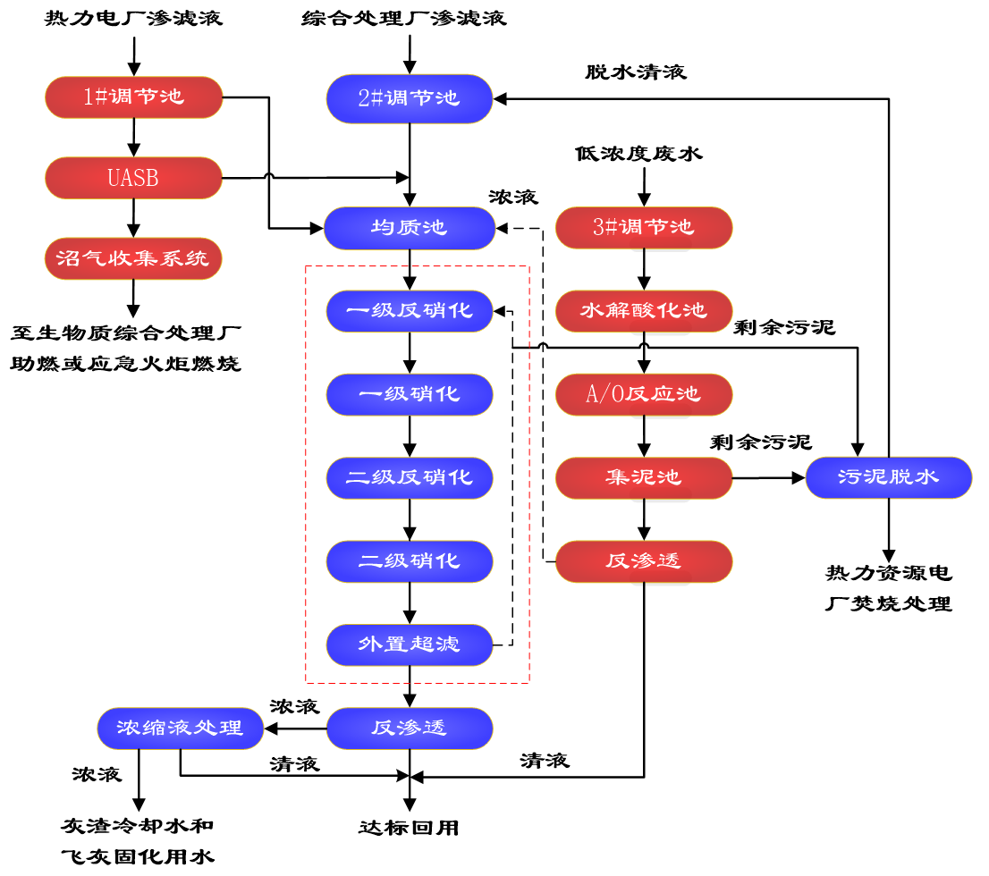 廣州東部固體資源再生中心內(nèi)的處理設(shè)施主要包括:第三資源熱力電廠、生物質(zhì)綜合處理廠(含餐廚綜合處理、死禽畜衛(wèi)生處理、糞便無害化處理)、市政污泥處理廠及公共配套工程的污水處理廠。本項(xiàng)目的污水處理廠是園區(qū)重要組成部分,用于處理園區(qū)內(nèi)產(chǎn)生的所有污水(包括高濃度污水和低濃度污水),達(dá)到回用標(biāo)準(zhǔn)并回用于園區(qū),實(shí)現(xiàn)園區(qū)污水“零排放”。