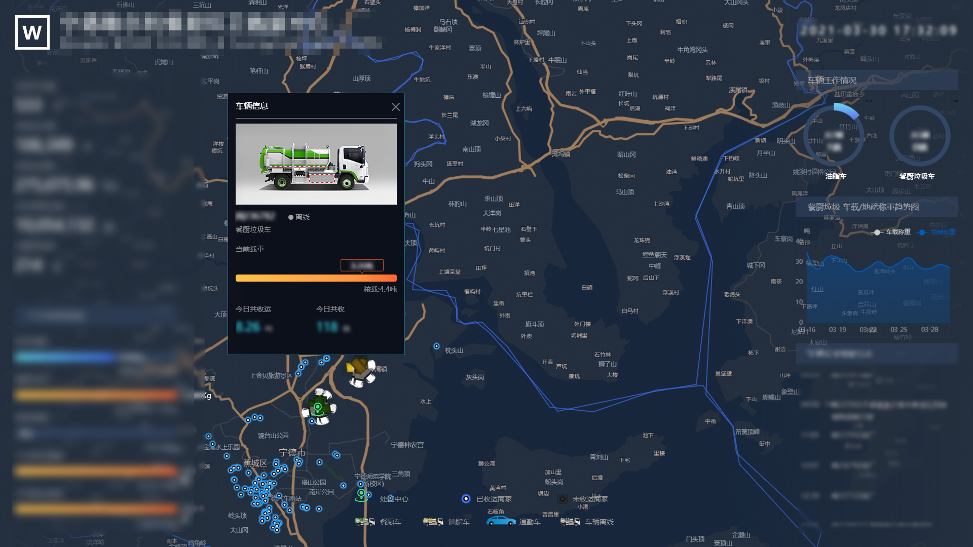 全方位無死角的收運作業全過程監管,通過一個數字化中心平臺,整合商家、人員、車輛、設備及事件處置信息,實現商家與車輛互聯互通、違規作業智能研判、事件中心任務調度、車輛全生命周期管養維護等,保障收運作業的安全、智能、高效與規范性。